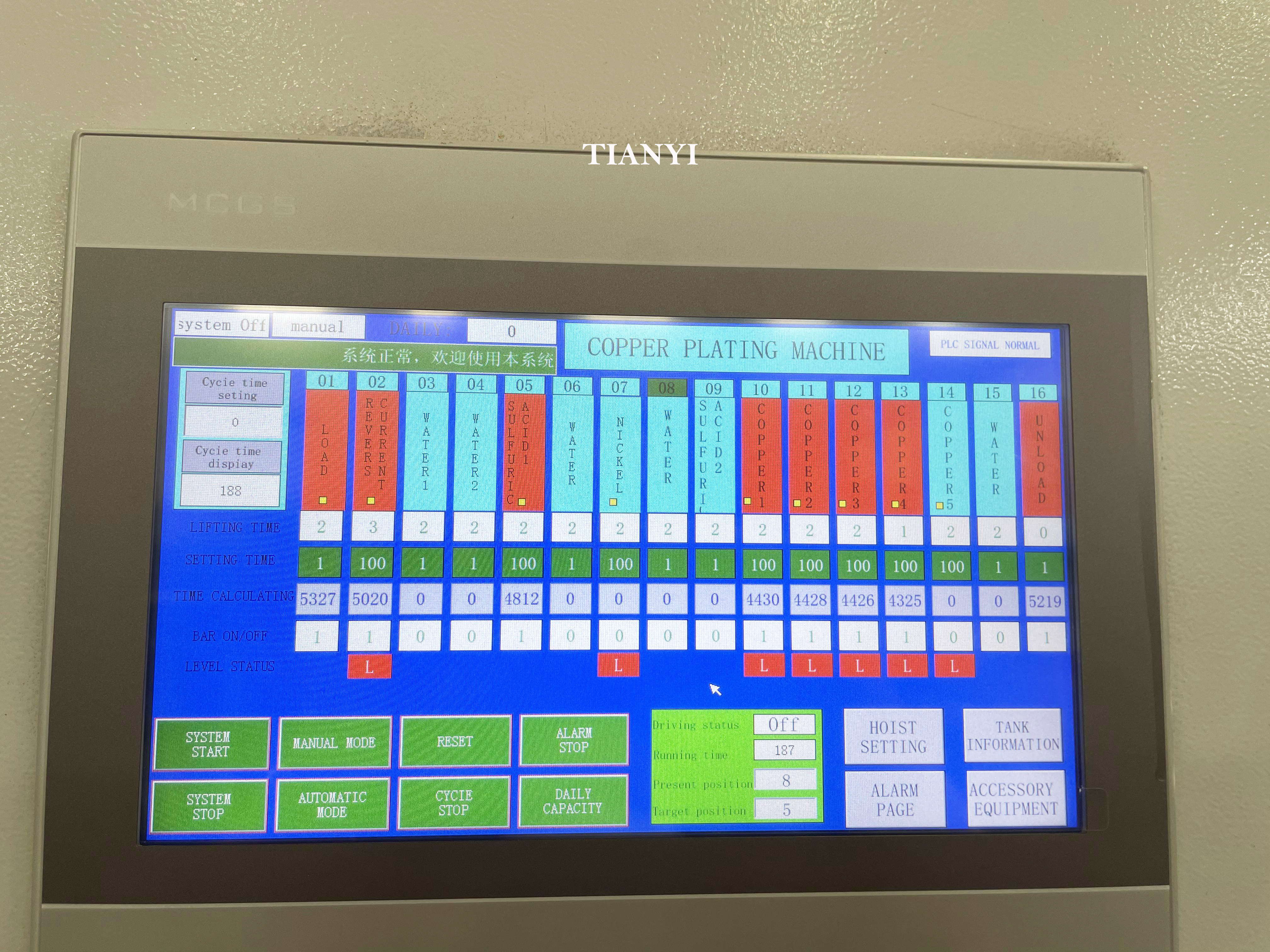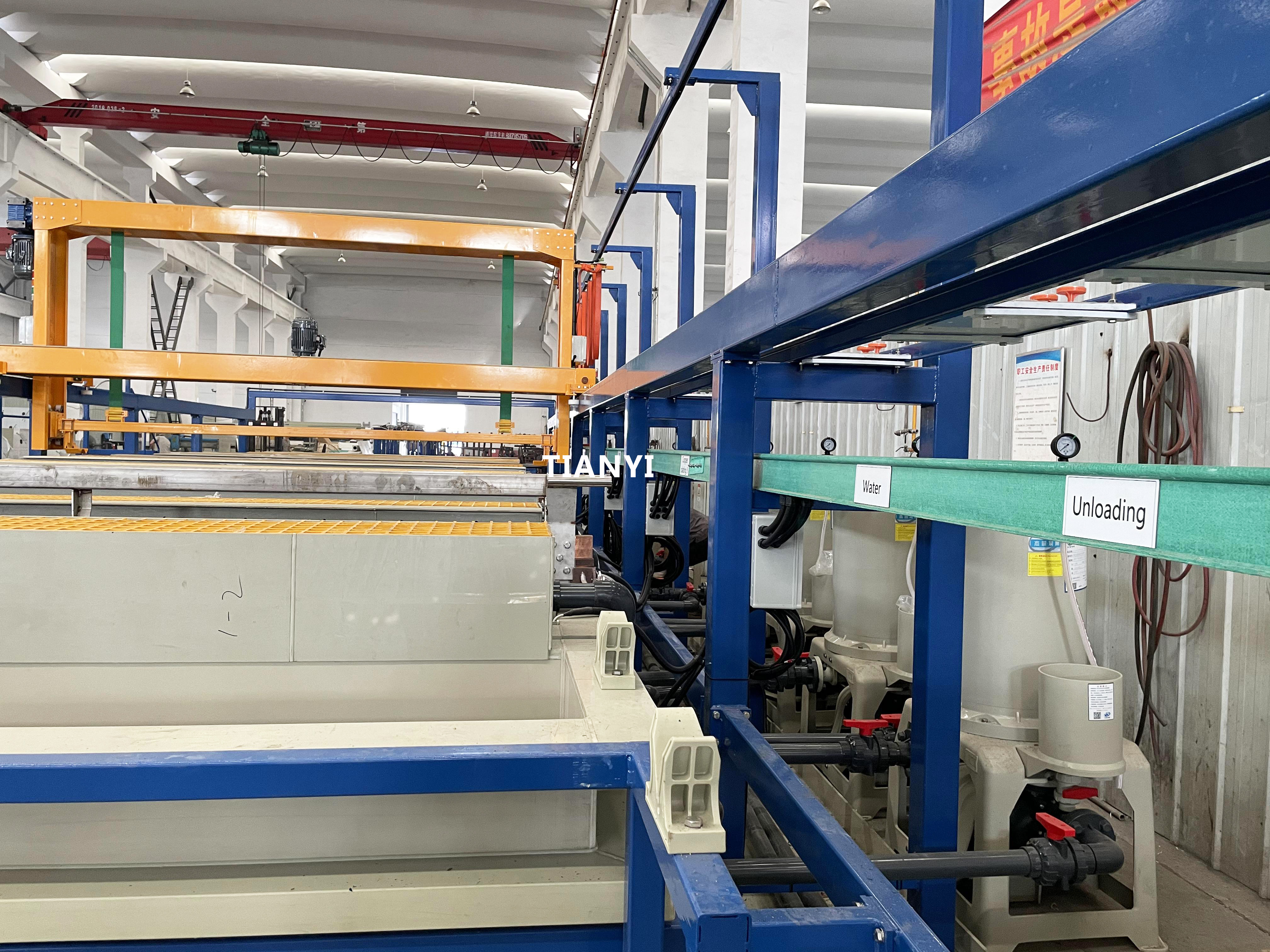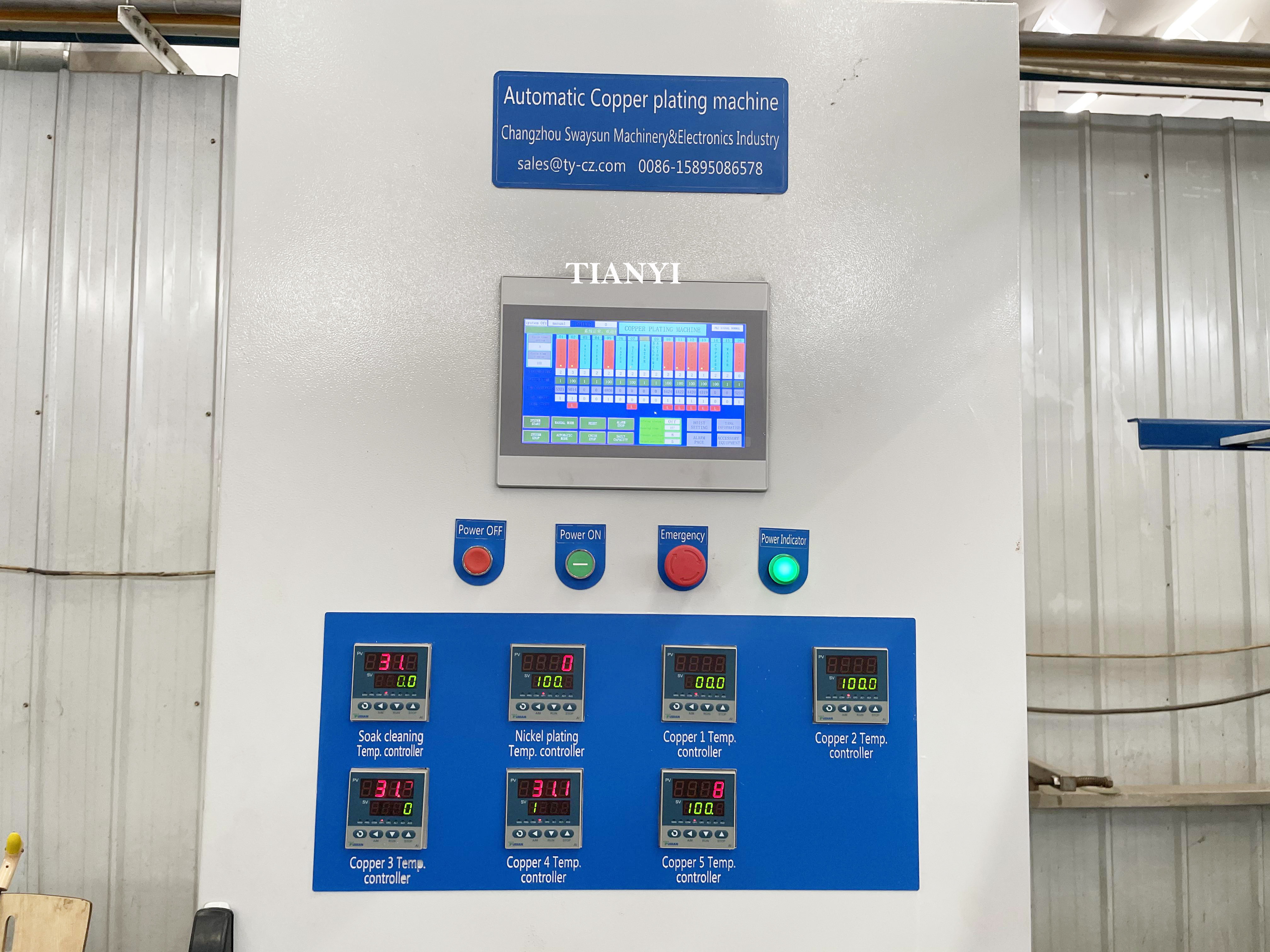 Copper plating machine process includes Loading → Reverse current → Water rinse1/2 → Sulfuric acid 1 → Water rinse1/2 → Nickelplating → Water rinse → Sulfuric acid 2 → Copper plating → Water rinse → Unloading