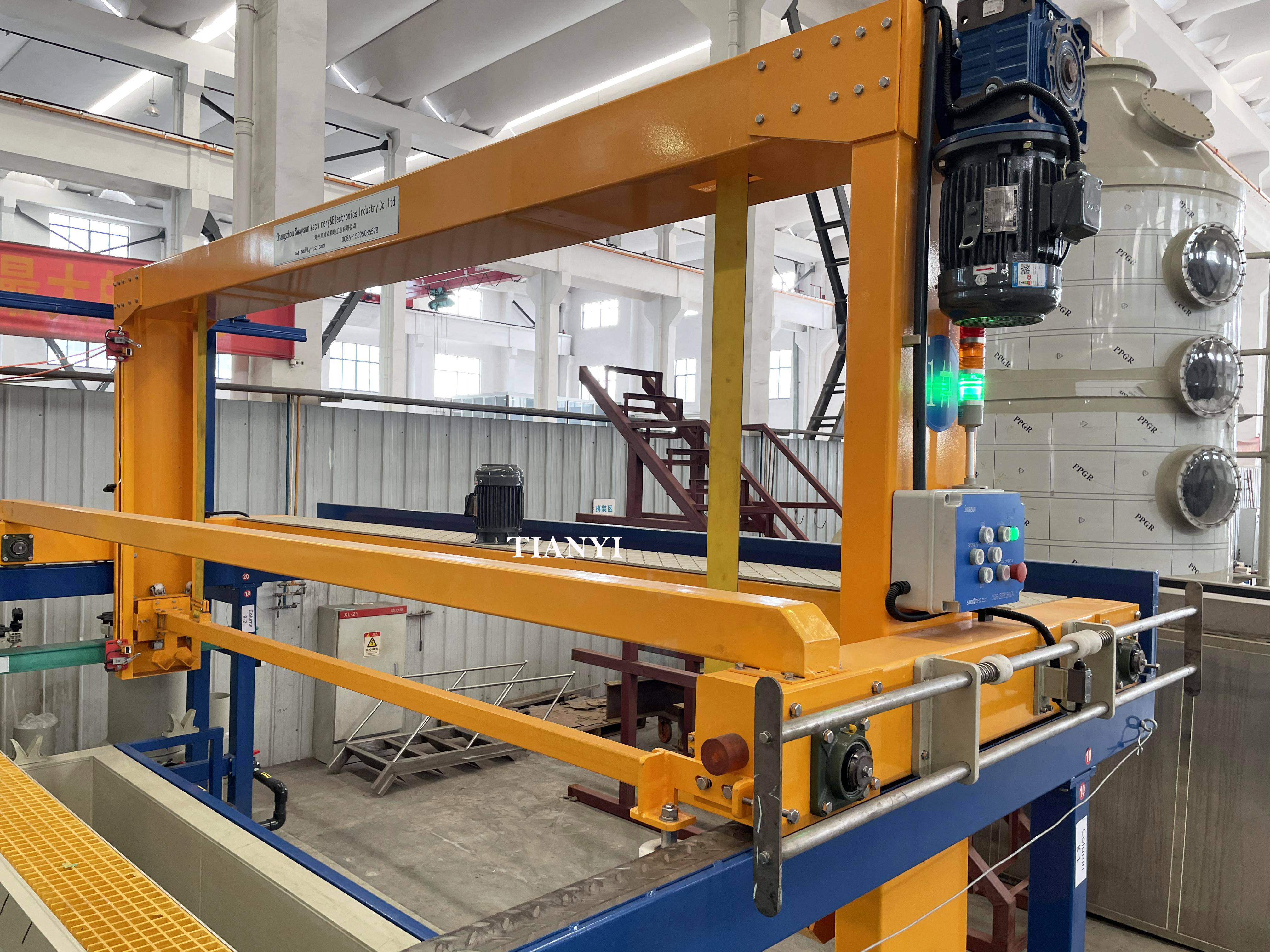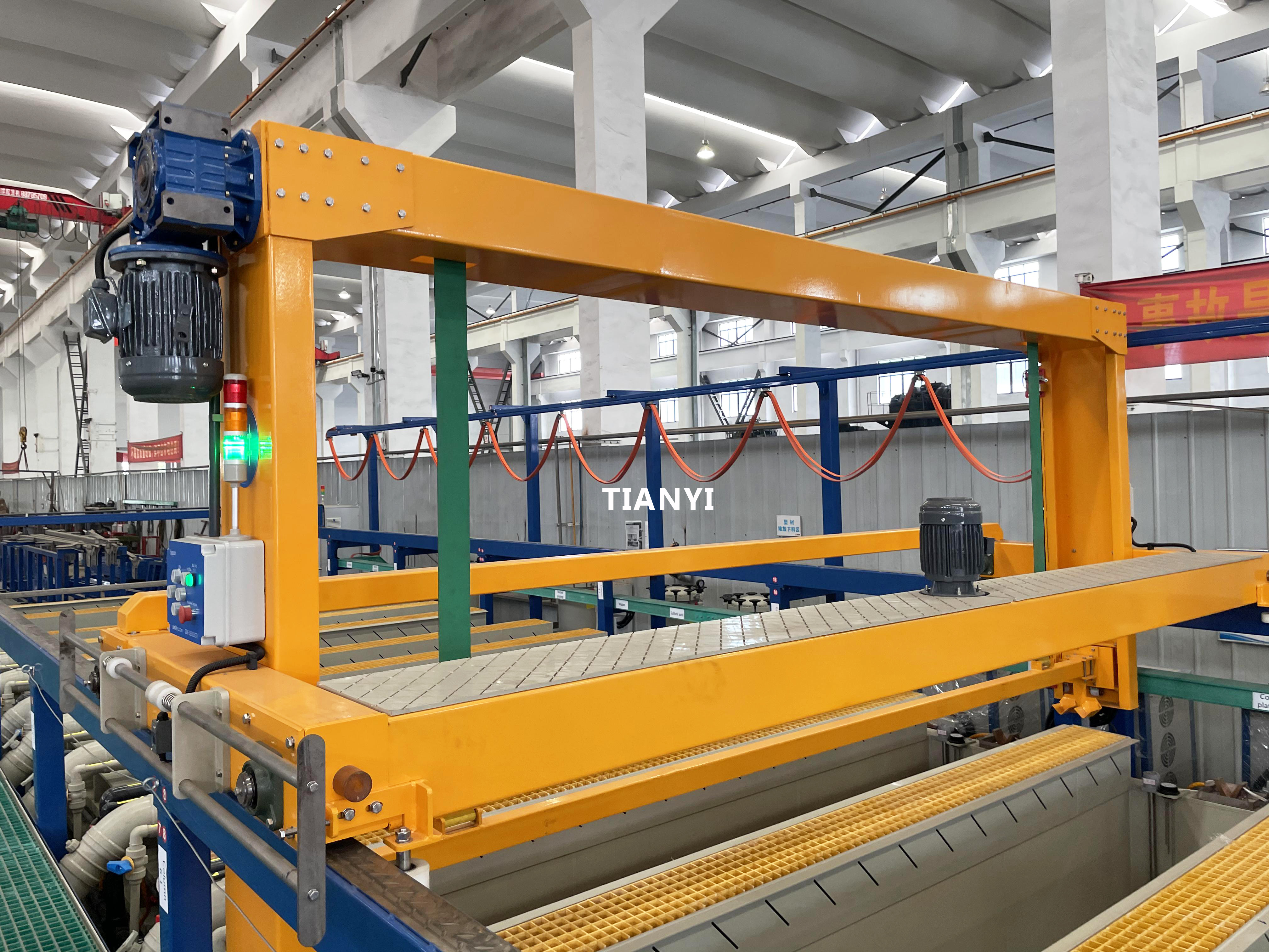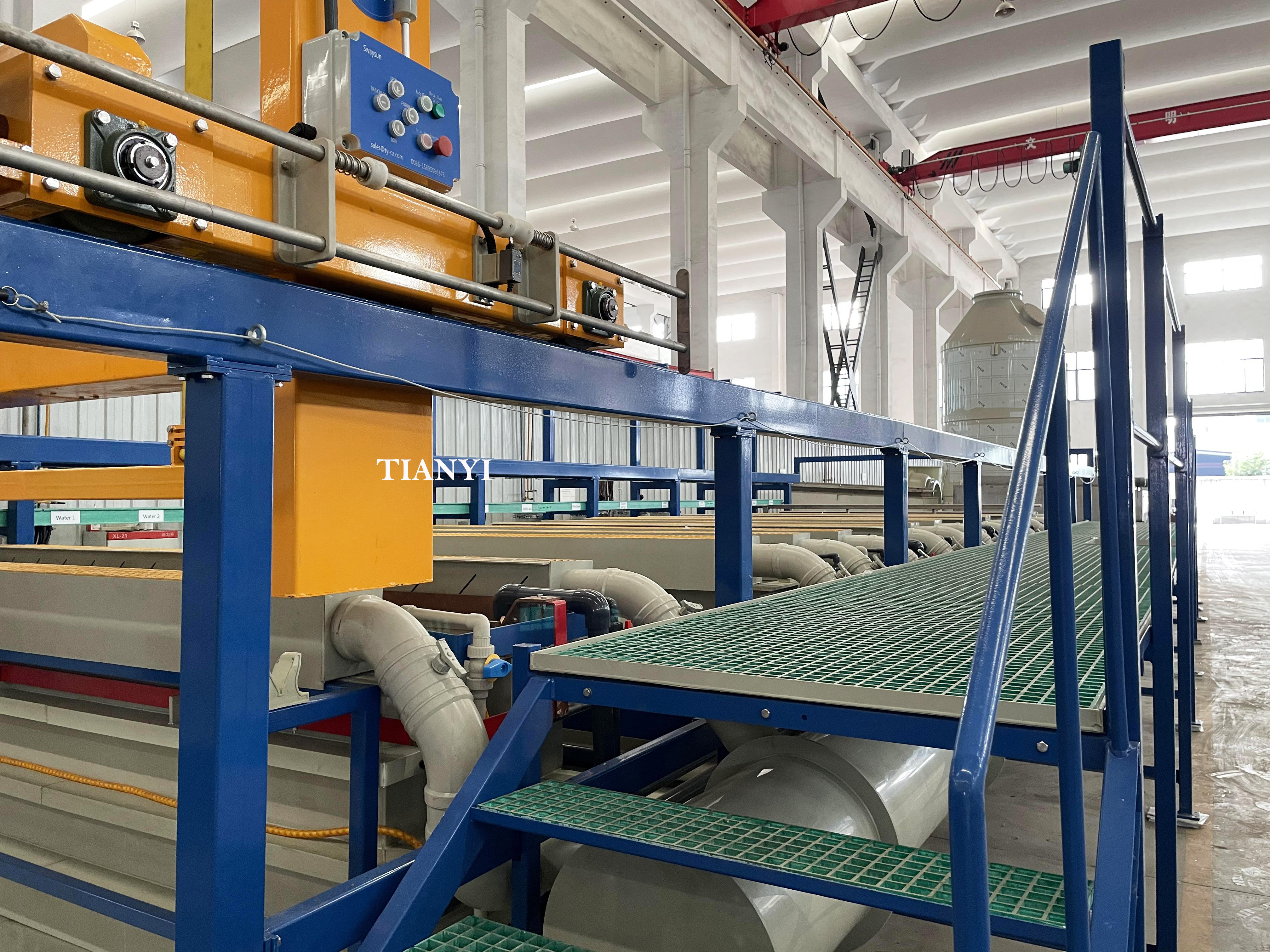 Copper plating machine process includes Loading → Reverse current → Water rinse1/2 → Sulfuric acid 1 → Water rinse1/2 → Nickelplating → Water rinse → Sulfuric acid 2 → Copper plating → Water rinse → Unloading